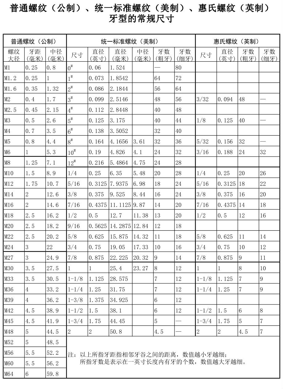 普通螺紋(公制)、惠氏螺紋(英制)、統一標準螺紋(美制)牙型的一些基本尺寸
